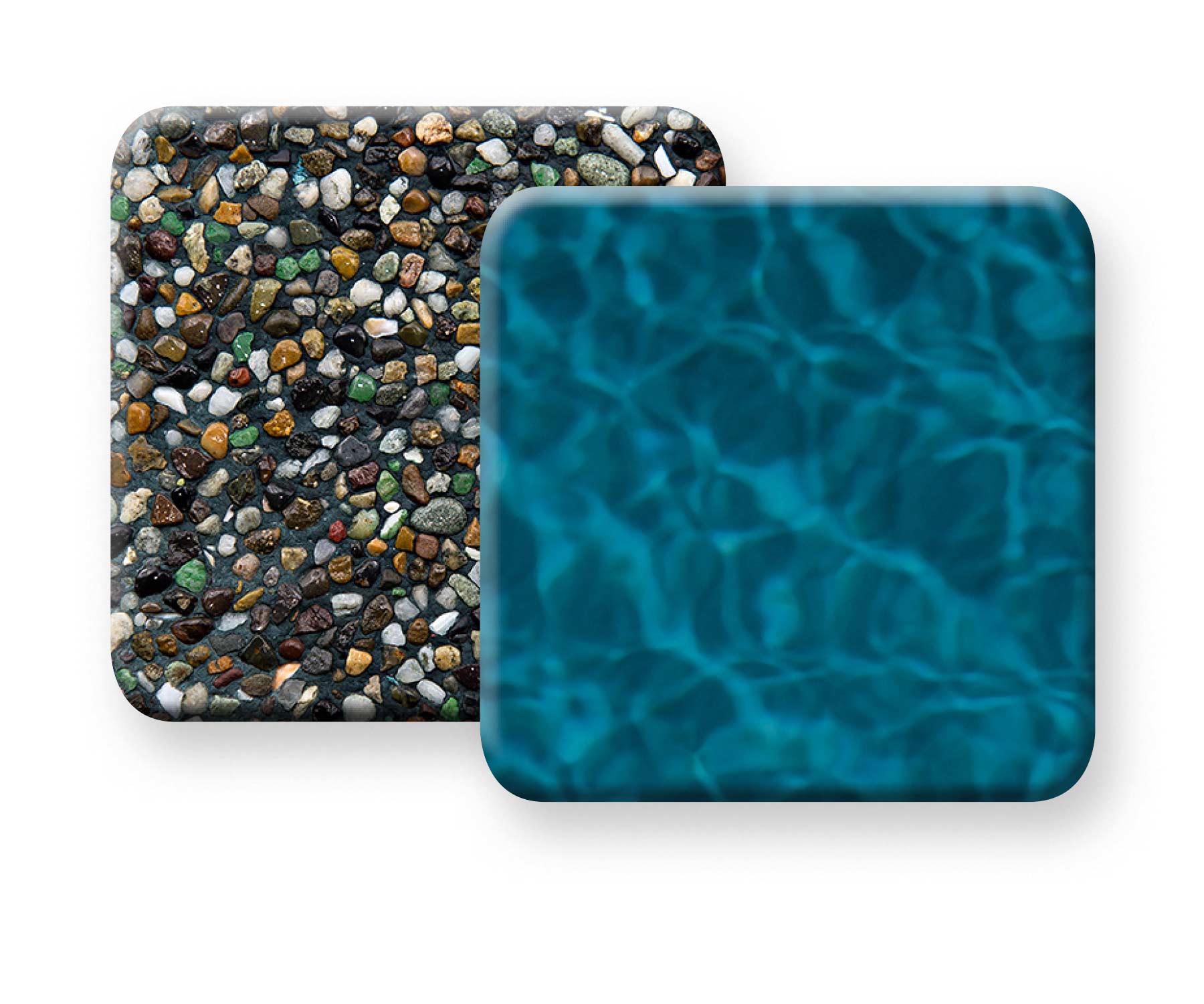 PebbleTec Emerald Bay: Yanmış turuncu, gri ve yeşil çakıl taşlarının yanı sıra iki farklı tonlarda kahverengi kayaların renkli bir karışımı, koyu mavi bir su rengi oluşturur.